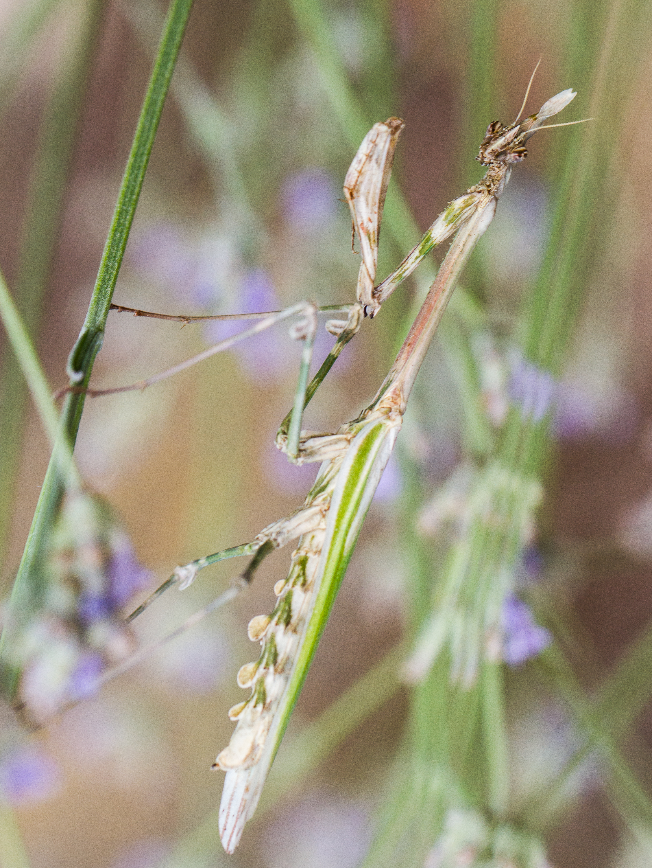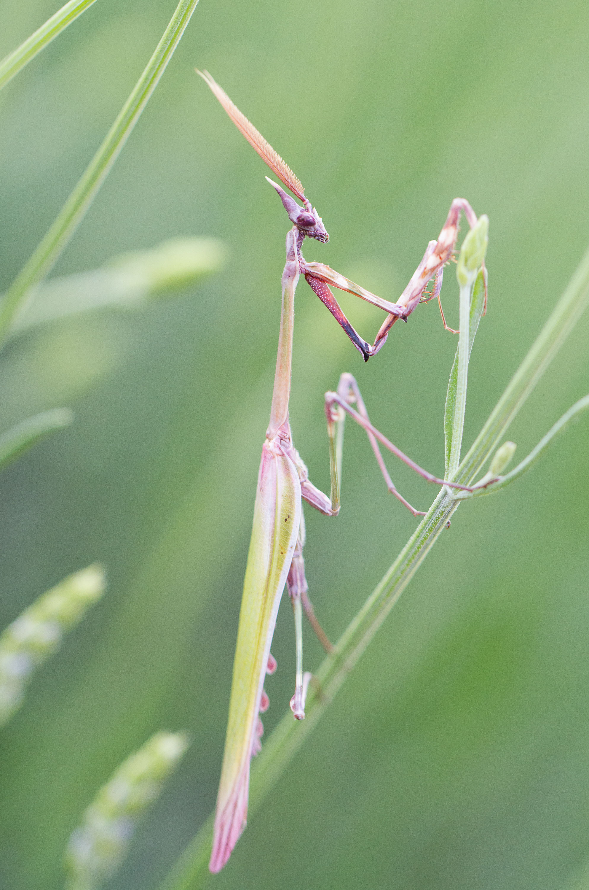 Empusa pennata è una Mantide appartenente alla famiglia delle Empusidae che prende il suo nome dalle lunghe antenne pennate presenti nel maschio. La sua livrea estremamente mimetica e le zampe captatrici anteriori dotate di una doppia fila di piccolissimi aculei sugli avambracci e di un lungo dito “prensile”, con il quale trattiene le prede, la rendono un temibile predatore per bombi, farfalle ed ogni altro insetto volatore che le capiti a tiro. E’ infatti estremamente specializzata nella “cattura al volo” ed è difficile immaginare, se non si assiste almeno una volta ad una scena di caccia, quanto sia abile e veloce nell’afferrare la preda. A differenza di altre mantidi la femmina non divora il maschio dopo l’accoppiamento ma si concentra sulla costruzione dell’ooteca, che può essere grande anche un terzo della madre e che dovrà essere deposta in tempo per far schiudere le uova prima dell’inverno, in modo che la stagione fredda venga affrontata sotto forma di neanide. Quello che più colpisce però osservando questo animale è il suo aspetto “alieno”, al quale sono stati probabilmente ispirate numerose creature mostruose della filmografia moderna.